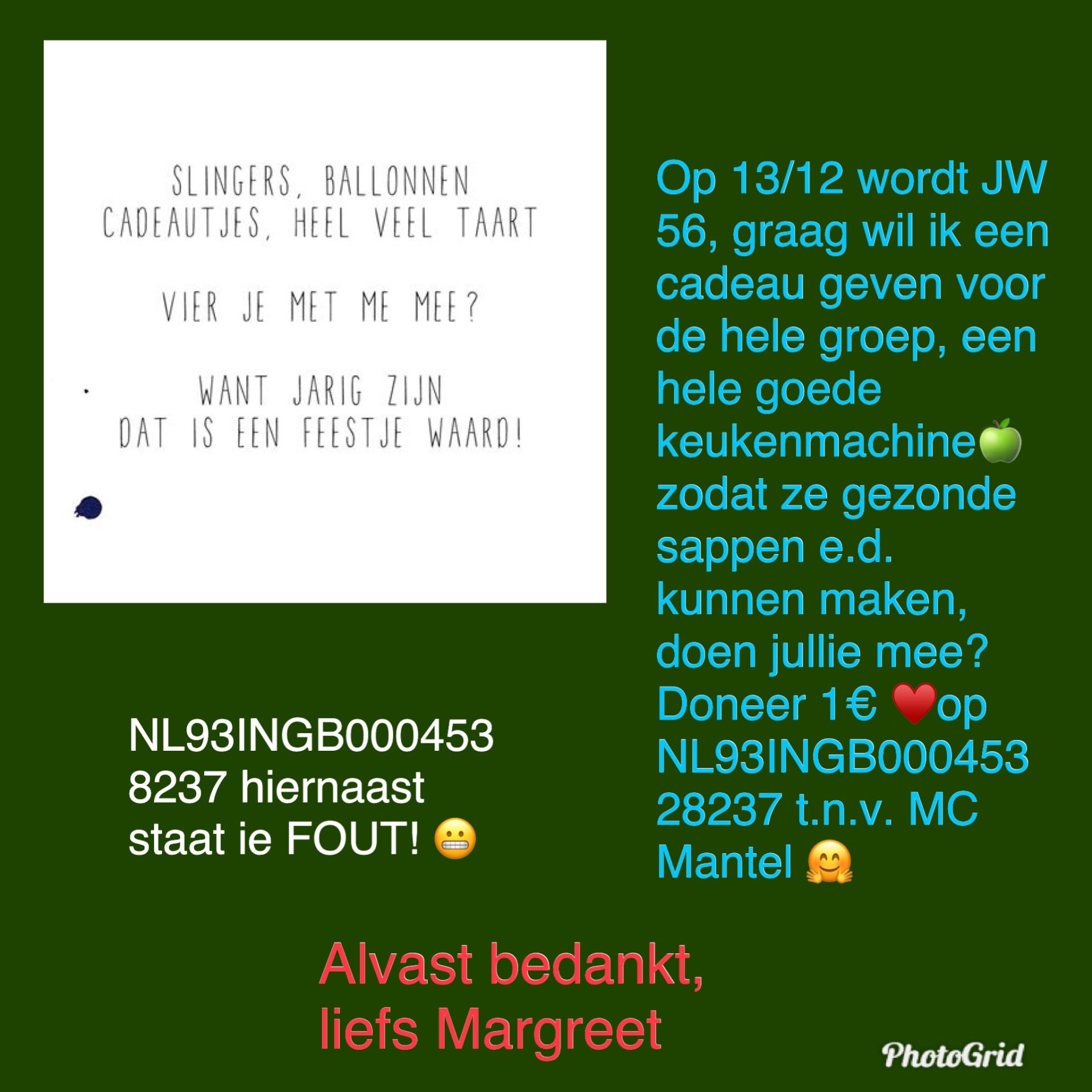 Dus zo gezegd, zo gedaan, bericht / foto gemaakt voor op facebook & instagram. Gelukkig een zeer snelle overmaakster die dus zag dat het rekening nummer niet klopte... dus in mijn foto het juiste nummer nog een keer gezet ;) beetje onhandig van me maar zal al te pielen met de tekst in het fotootje... Ach, zo kan het ook. Als iedereen 1,00 geeft... dan komen we een heel eind dacht ik!!