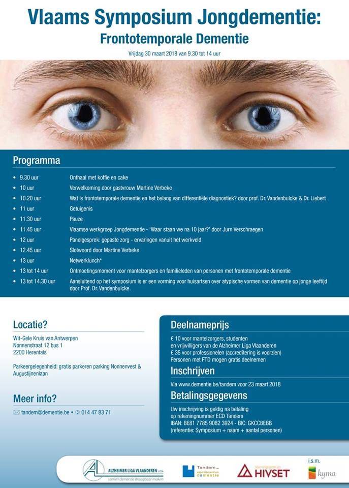 op 30 maart is er het eerste Vlaamse symposium over FTD! hoe mooi, er zijn heel veel Belgische lotgenoten die naar onze FTDlotgenotendagen komen omdat er in Vlaanderen niets is, of heel weinig, ook geen gehoor bij dementie bijeenkomsten, omdat het zo anders is... onze Belgische carer Martine is de gastvrouw op het congres. Ik was met haar ook op 7 februari in Antwerpen. Daar hoorde ik bijvoorbeeld ook...
