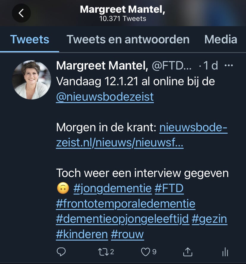 13 januari 2021 Toch nog een interview gegeven. Nieuwsbode Zeist, dit mede doordat ik gevraagd werd door een ouder van de basisschool van vroeger en ik het natuurlijk belangrijk vind dat FTD op de kaart staat en komt te staan.... https://www.nieuwsbode-zeist.nl/nieuws/nieuwsflits/1036753/afscheid-van-jonge-partner-met-dementie